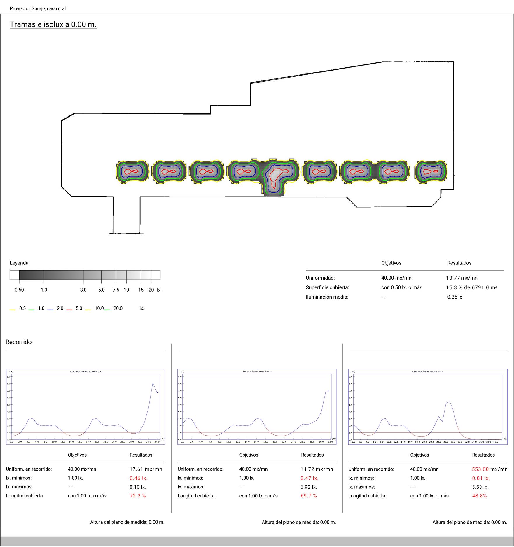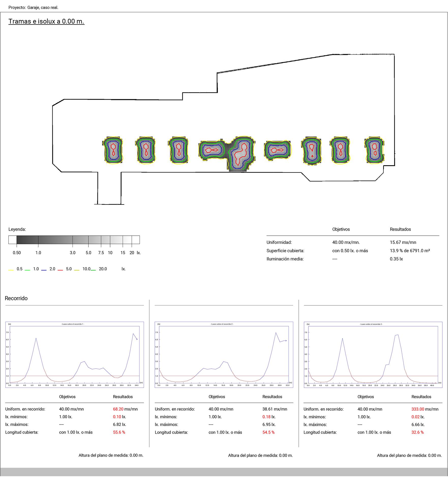 En el ejemplo se puede observar que no se llega el mínimo exigido de 1 lux en los recorridos de evacuación.